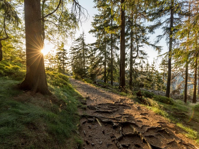Windeck ist das am höchsten gelegene Portal des Heilklima-Parks. Auf den hier startenden Wegen herrschen selbst im Sommer überwiegend kühle bis behagliche Verhältnisse vor. Und wenn weiter unten im Park die Luft bereits als zu warm empfunden wird, herrschen hier oben oftmals noch ideale thermische Bedingungen zum Wandern: Die Lufttemperaturen sind niedriger, der Wald schützt vor direkter Sonne und im Bereich der wenigen Schneisen sorgt ein stärkerer Wind für Abkühlung. Auch auf dem kurzen Rundweg wandert man um die Lichtung des Kleinen Feldberges, so dass hier die Sonne an gering bewölkten Tagen stimulierend auf den Organismus wirken kann. Im Winter dominieren die Kältereize. Dann schützt der Wald meist vor einer zu starken Auskühlung. Kurzfristig können aber im Bereich der Schneisen die Reizintensitäten sehr hoch sein.