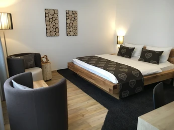 Suiten: Stilvolles Interieur mit alpiner Note, eine feine Mischung aus Echtholz und hochwertigen Stoffen: Unsere neuen Suiten empfangen euch mit einem perfekt durchdachten Raumkonzept, warme Erdtöne greifen die Natur des Sauerlandes auf. Im Überblick: großer Wohnraum mit Sitz- u. Essbereich, Küchenzeile, bis 55 Zoll Flatscreen-SatTV, WLan kostenfrei, Radio, Telefon, Balkon sowie ein oder zwei separate Schlafzimmer zur Waldseite, modernes Bad mit Dusche/WC. Belegung bis zu 5 Personen möglich.