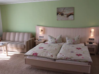 Zimmer: Gemütliche eingerichtete Doppel- und Mehrbettzimmer mit Dusche/WC, TV, Radio, überw. Balkon und Telefon, 2 Appartements mit zusätzlicher Küchenzeile, kostenloses WLan.
