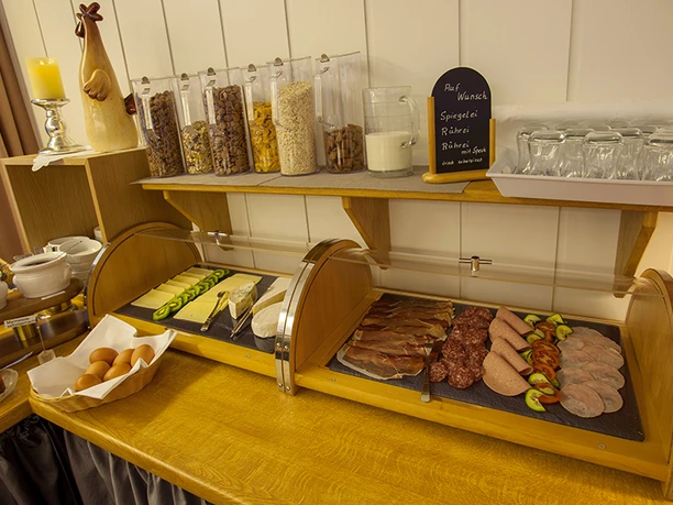 Auf Wunsch können die Gäste der Appartements/Ferienwohnungen am reichhaltigen Frühstücksbuffet teilnehmen.